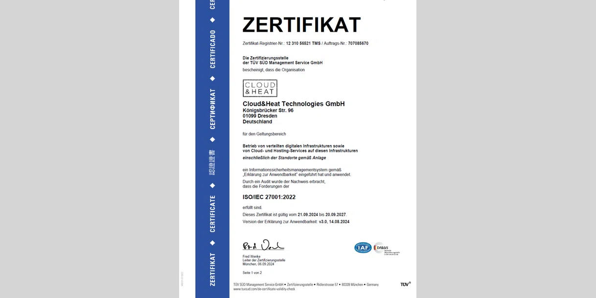 ISO/IEC 27001:2022 certification enables Cloud&Heat Technologies to strengthen the trust of our customers and meet legal requirements.