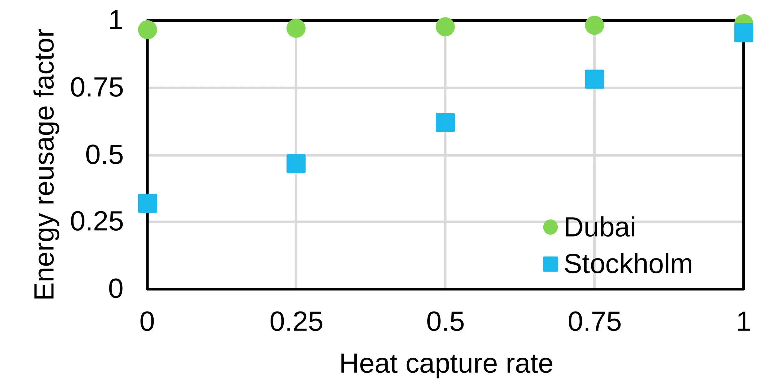 Fig. 1: Energy Reusage Factor depending upon Heat Capture Rate for cold (Stockholm, Sweden) and hot climate (Dubai, United Arab Emirates).
